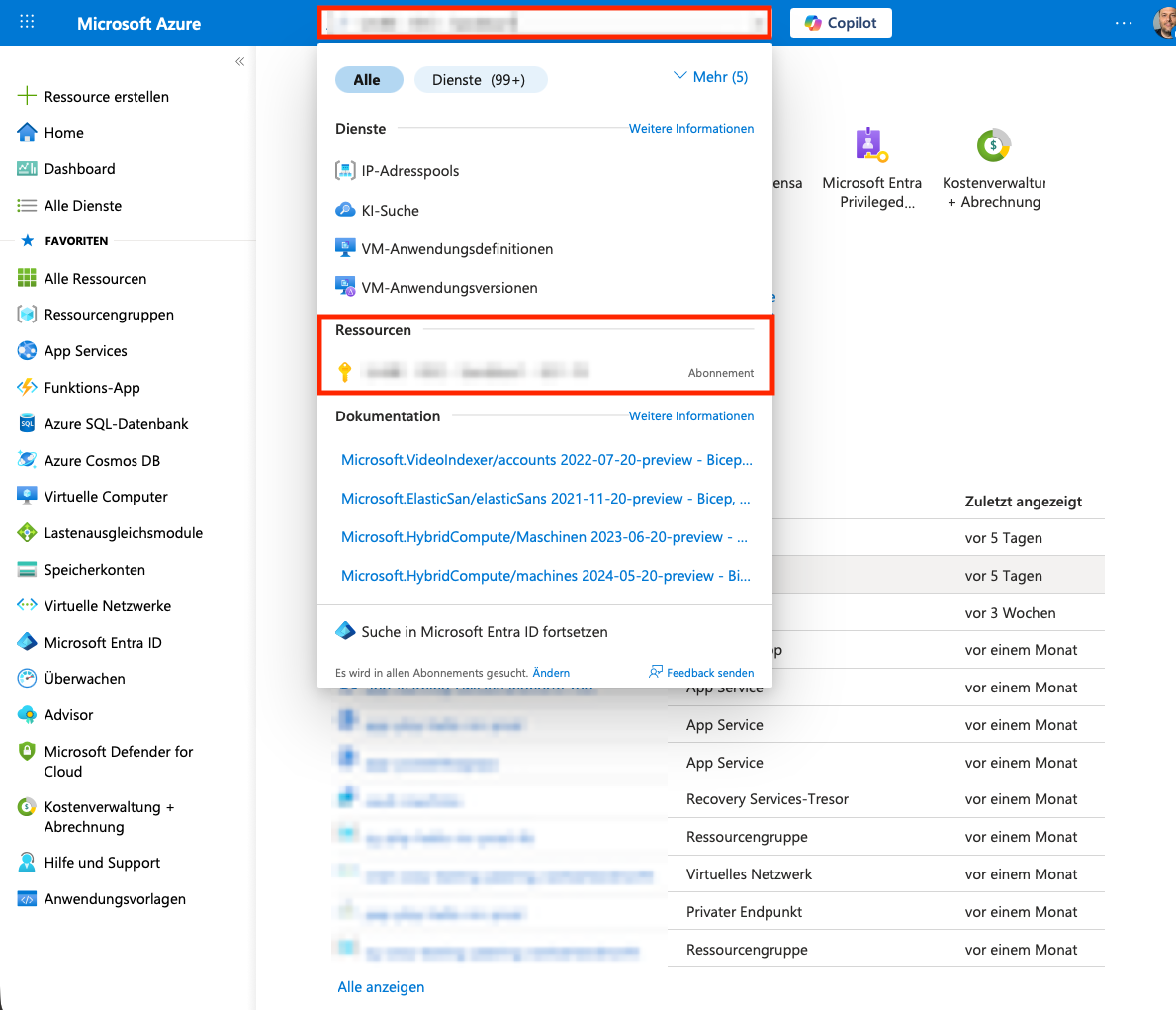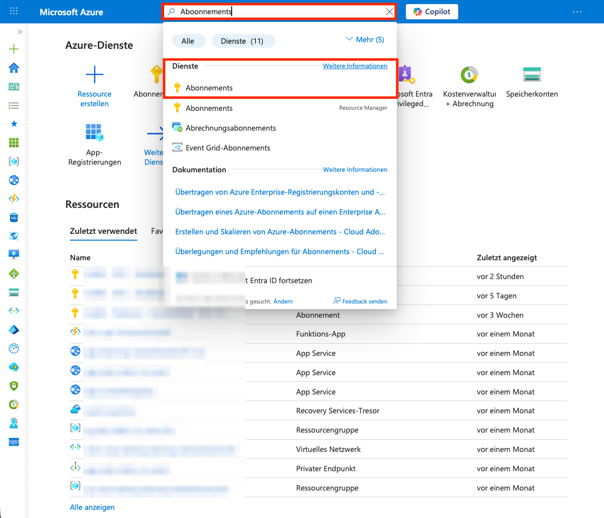 - Der Name der Subscription kann in der globalen Suche eingegeben werden.