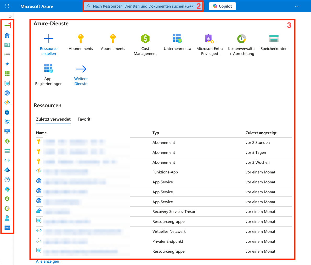 Das Azure Portal gliedert sich in die folgenden wichtigen Bereiche: