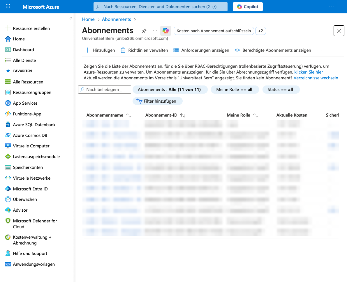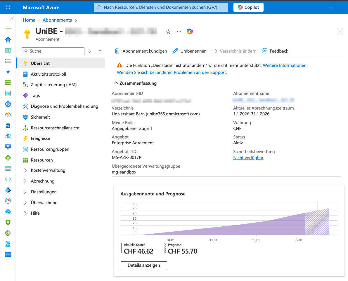 Subscription IDhervorzuheben, welche die intern verwendete eindeutige Kennung einer Subscription darstellt. DieTenant IDbezeichnet die eindeutige Kennung des Azure Tenant der Universität Bern. - Die laufenden Kosten der Ressourcen der Subscription werden angezeigt. Zusätzlich wird eine Prognose der voraussichtlichen Kosten bis zum Monatsende bereitgestellt.