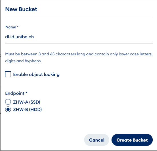 - Bucket erstellen im Portal der Switch Cloud: