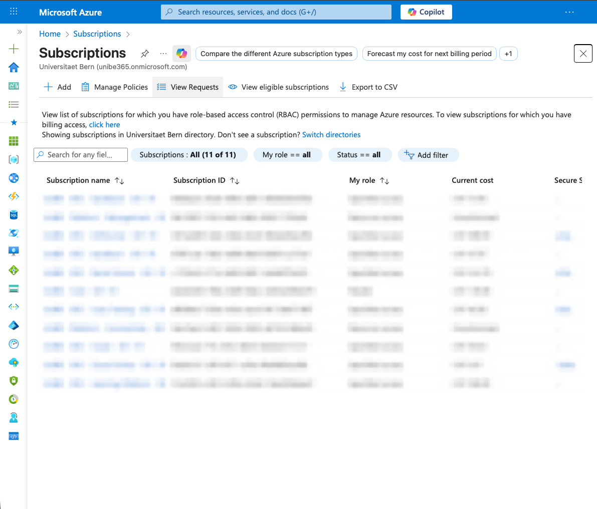 Subscription ID, which represents the internally used unique identifier of a Subscription. TheTenant IDdenotes the unique identifier of the Azure Tenant of the University of Bern. - The current costs of the resources in the Subscription are displayed. Additionally, a forecast of the expected costs until the end of the month is provided.