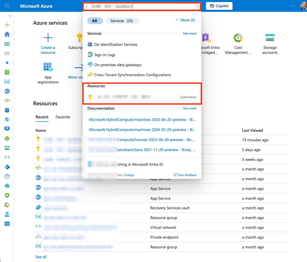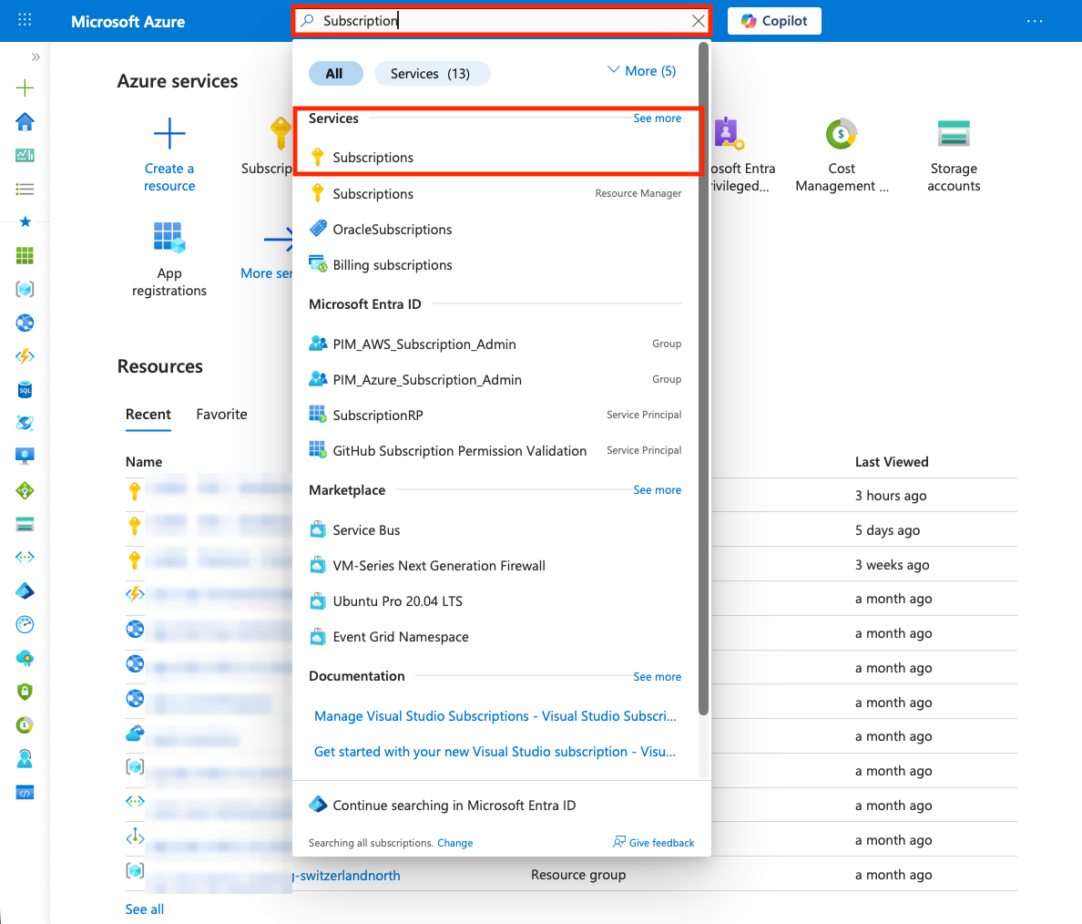 The name of the Subscription is entered in the global search text field of the Azure Portal. The Subscription is then displayed in the search suggestions under Resources.