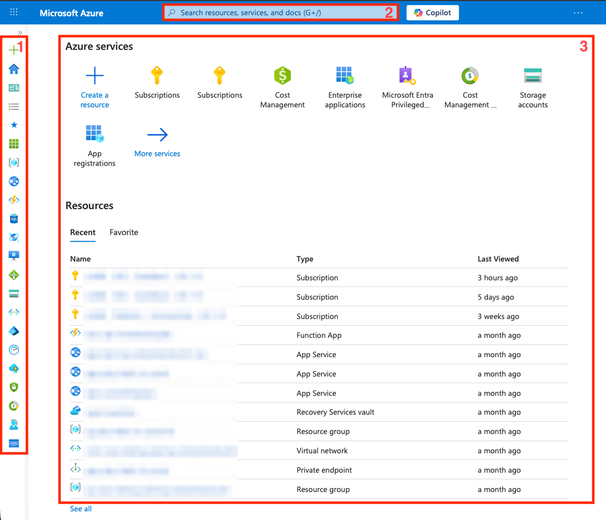 - Collapsible portal navigation with a list of Azure Services. This menu is configurable and displays the favorited services.