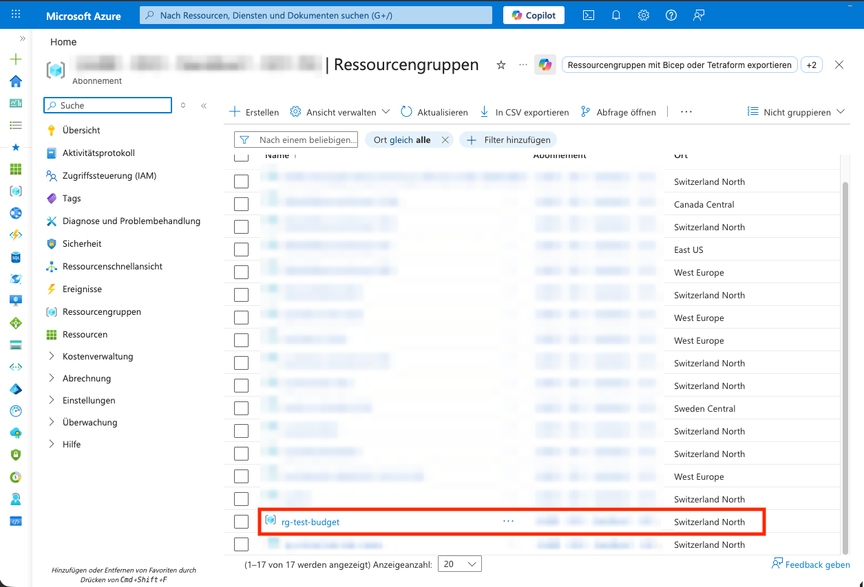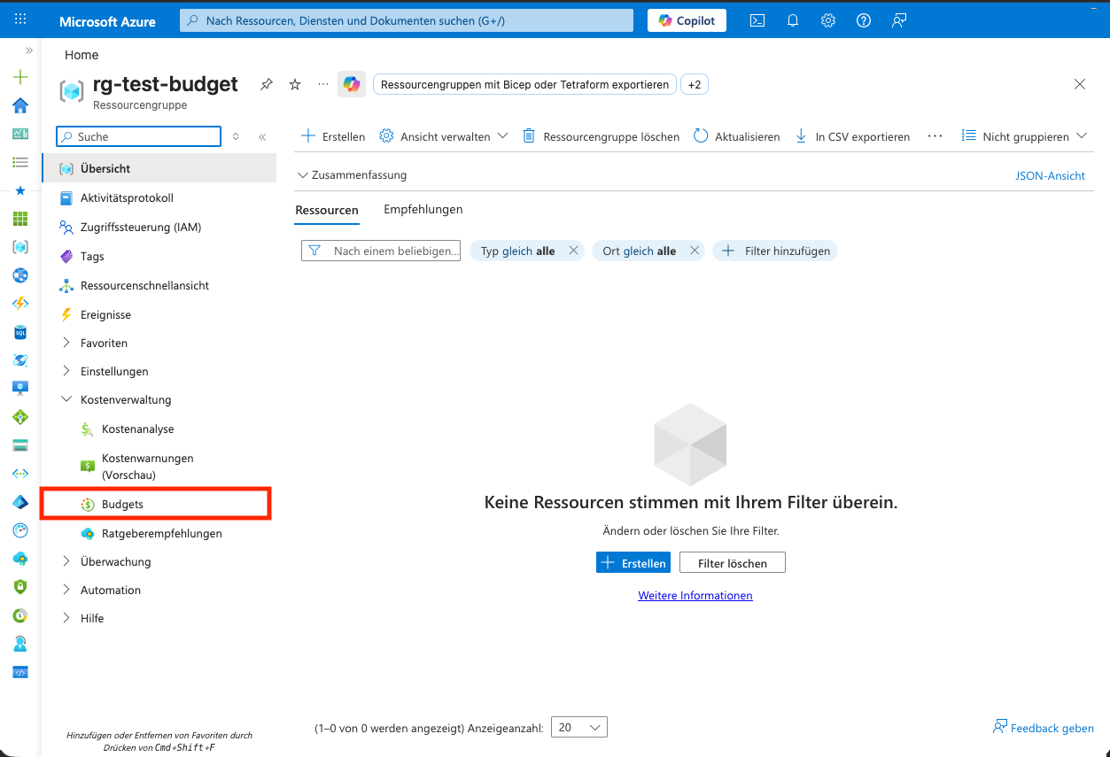 Resource groupsand select the Resource Grouprg-test-budget. -