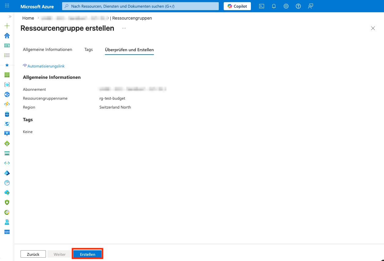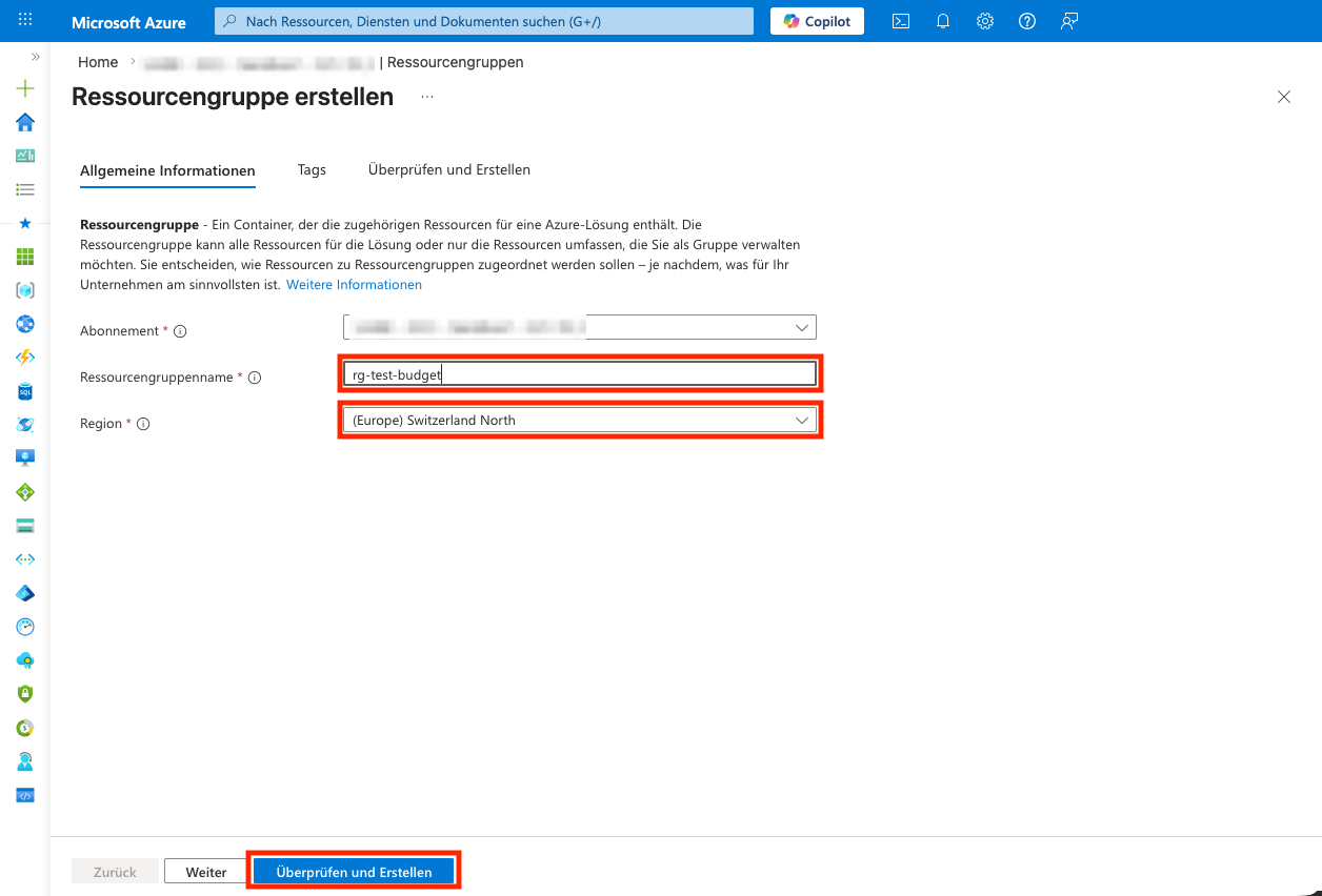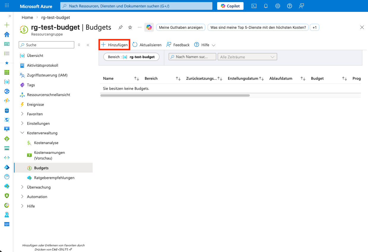 Budget Scoping, the newly created Resource Grouprg-test-budgetshould be selected. This can be left as is. UnderBudget Details, the exact rules can be set (e.g., when the budget resets). Enterbudget-testas the name. UnderBudget Amount, the budget limit can be set. Enter10as the amount. ClickNext. -