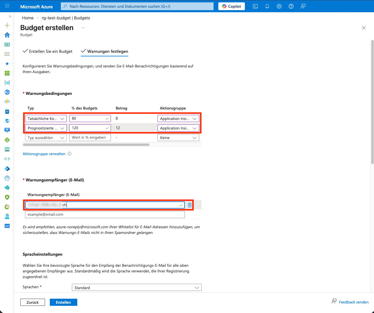 Alert conditions, selectActualas theTypeand enter80as% of budget. A new line should appear below. Here, selectForecastedas theTypeand enter120as% of budget. UnderAlert recipients, the email address can be entered directly. ClickCreateto finish.